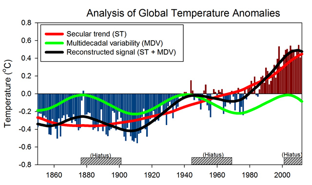 دانشمندان JRC داده های دمای سطحی ثبت شده از ۱۸۵۰ را برای جدا کردن تنوع طبیعی آب و هوایی از گرمایش سکولار را آنالیز کردند. آنها سه وقفه یافتند(۱۸۷۸-۱۹۰۷، ۱۹۴۵-۱۹۶۹ و ۲۰۰۱ تا حال، که در طول این وقفه ها گرمایش جهانی کاهش یافته است. این وقفه ها همزمان با فاز سرمایش طبیعی، تنوع چند دهه ای (MDV) است، که به احتمال زیاد ناشی از نوسانات طبیعی اقیانوسی می باشد. دانشمندان نتیجه گیری کردند که علت اصلی این وقفه ها MDV است که در طول آن گرمایش جهانی کاهش یافته است.