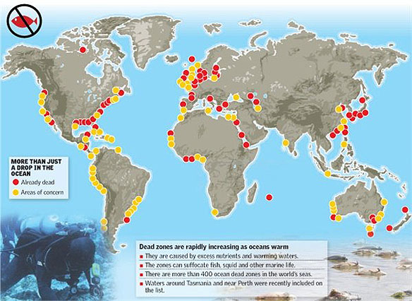 نواحی مرده اقیانوس، مناطقی هستند که سطح اکسیژن در آنجا پایینتر از آن است که از حیات آبزیان حمایت کند. این نواحی درحال رشد هستند تا آنکه سرانجام به ویژگی رایجی در مناطق ساحلی سراسر جهان تبدیل شوند.